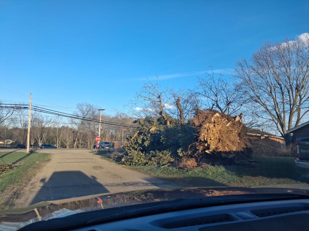Roofs were torn off the Broadway Brewhouse in New Philadelphia and Superior Clay in Uhrichsville, and first responders spent hours dealing with downed trees, power lines, brush fires, and outages. A semi even tipped over on the I-77 north on-ramp in New Philadelphia.