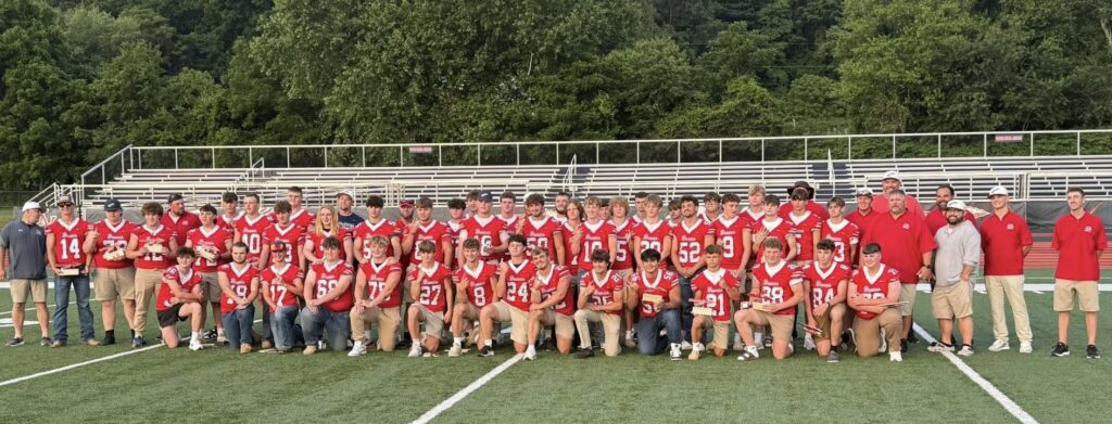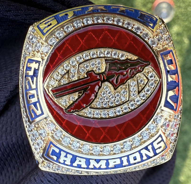 The Indian Valley Braves celebrated their 16-and-0 football season and Division 4 state championship at Braves Stadium. Each player received a bejeweled gold ring featuring a red arrowhead over a football inscribed with their name and team’s accomplishments.