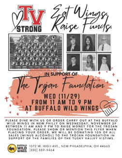 Coming up tomorrow, the New Philadelphia Buffalo Wild Wings (BWW) location will run an all-day fundraiser, from 11 a.m. to 9 p.m., for the Trojan Foundation. BWW will donate 10% of all sales (minus alcohol) to the Trojan Foundation. When placing an order, on Wednesday, November 28th, show or mention the “Eat Wings. Raise Funds.” fundraiser.