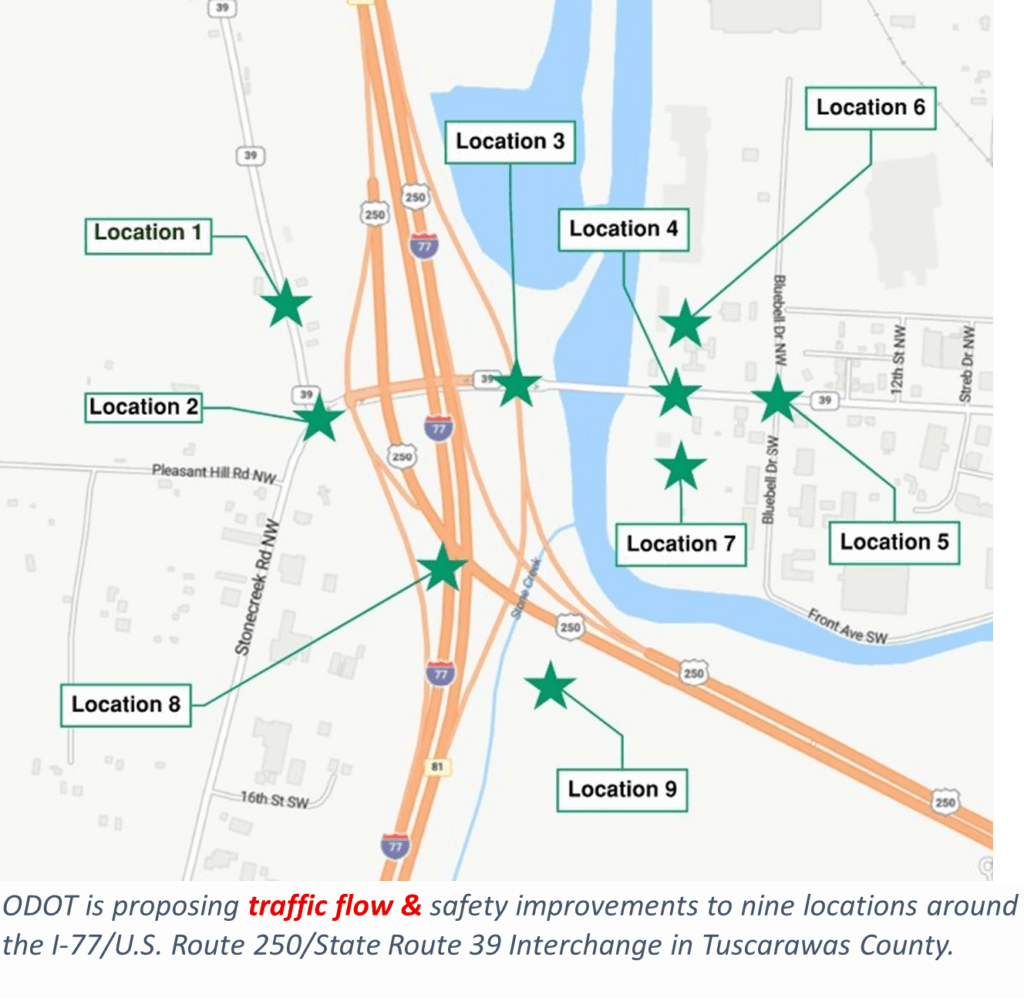 - Location 2: Intersection of I-77 Southbound/U.S. Route 250 Eastbound – on ramp and relocated State Route 39 and Stonecreek Road