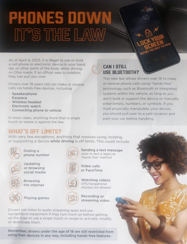 Governor Mike DeWine notes that using a device is now a primary offense with penalties including a first offense fine of $150 and points assessed to a driver’s license.