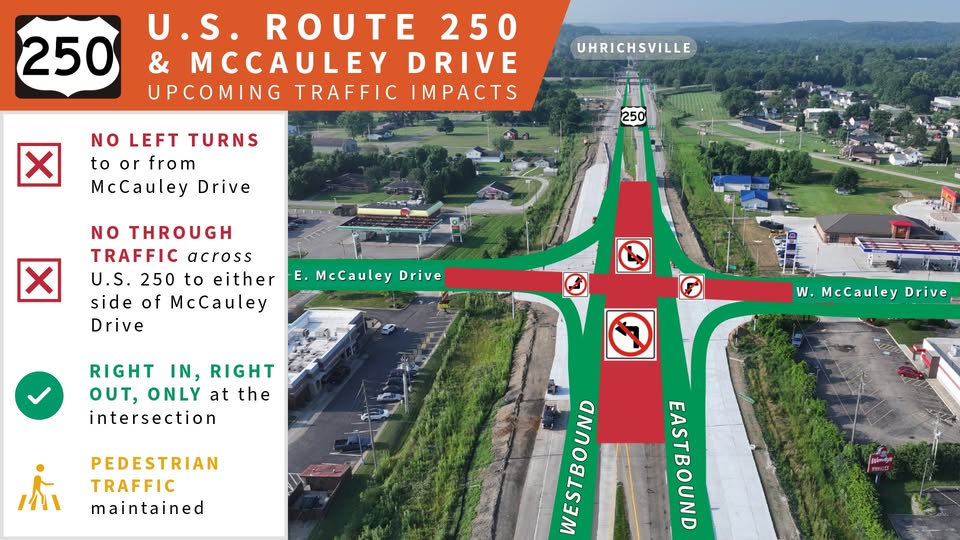Ohio Department of Transportation District 11 Public Information Officer Lauren Borell says there will be no left turns permitted from either direction of McCauley Drive and US 250.