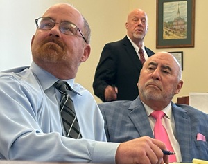 Carl Reynolds, left, and his attorney Christopher DeLaCruz look at a slide projection as Assistant Prosecutor Scott Deedrick presents his closing arguments
