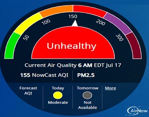 The current local air reading is at 155 and this is due to the wildfire smoke in Canada moving across several US states.