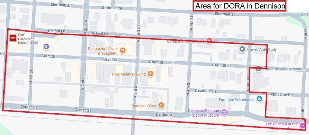 Known as a DORA, participating establishments can sell alcohol in a specific cup allowing the buyer to walk in a designated area, and for Dennison this includes the downtown sections of Center Street and Grant Street.